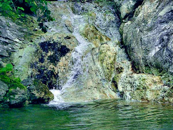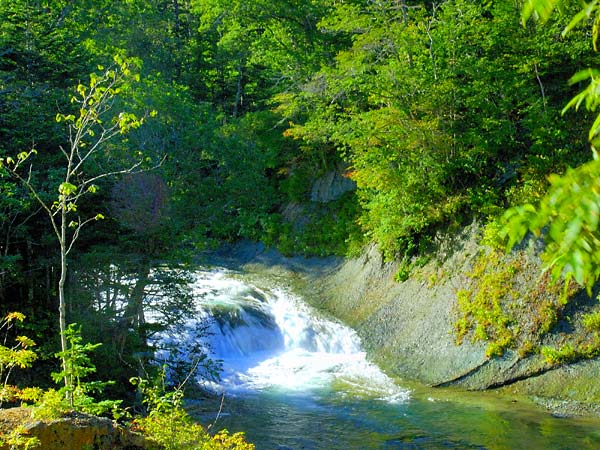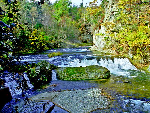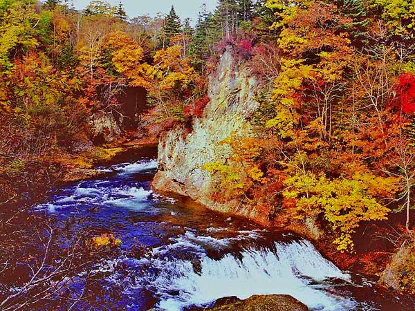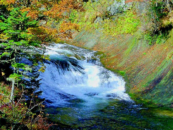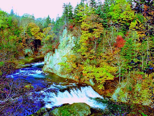 名峰斜里岳を水源に国道に沿いながら流下する名流忠類川は中流域から上流は殆どが函状の中を駆け下る原始峡だが金山の滝を境に穏やかな流れに姿を変えて根室海峡に注ぐ。山女釣りファンには今も憧れの川だ。函、淵、滝などが随所にあり紅葉の時期は絶景。あまりにも厳しい流れにベテラン釣り師も減水の時期以外に入川する事は難しい。金山の滝は国道脇の公園から見る事の出きる唯一の滝です。斜里から標津に向かい根北峠を超え進むとまもなく金山スキー場の看板がありそこを左折しスキー場に向かうとすぐ滝見橋に出る。この橋から上の金山の滝(女滝)を眼下に望めます。国道に戻り更に国道を標津に向かうと左側に金山自然公園があり滝の看板。ここが「標津十景」金山の滝(雄滝)だ。滝そのものはそれ程大きく有りませんが、きれいな渓谷の中では存在感があり、秋には見事に紅葉した渓谷美を誇示、是非お立ち寄りを。金山の滝が二つあるが雄滝と女滝という言い方も有るようだ。滝には直接降りるルートがなく、金山橋から川北温泉に向かう林道筋から川に入る。