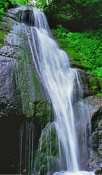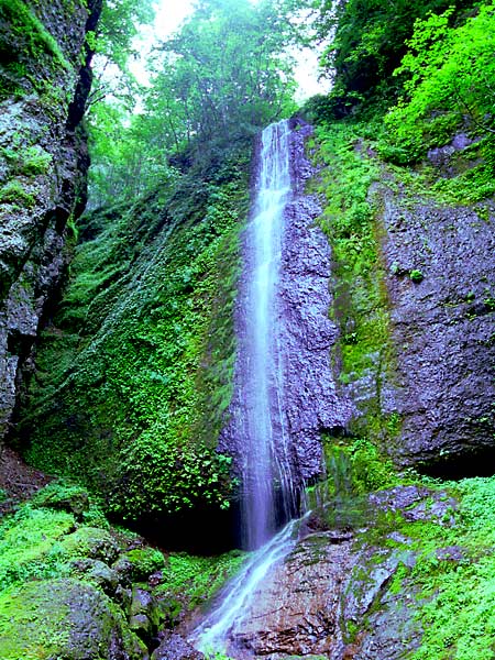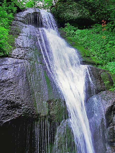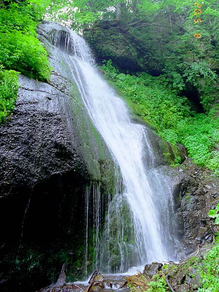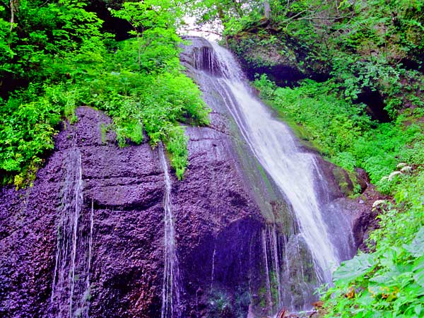 屈斜路湖に注ぎ込む尾札部(おさっぺ)川の源流部には、知る人ぞ知る名瀑が二つある。国道を走っていると和琴半島近くで尾札部川にかかる夕暮橋から尾札部川沿いに上流に向かう道がある。最初は舗装路だがすぐダートになりまもなく林道のゲート。鹿防護柵と一体になっているので通行の際は必ず閉めておく事が必用。尾札部川沿いに続く林道を車が入れる所まで進むが、最後まで行ける事は少ないかも。今回は途中で林道の崩壊があり、およそ林道を300m近く歩いた後、沢沿いの踏み跡をたどったが夏草が伸びていて踏み跡が判りにくい所が多く、面倒になり尾札部川の遡行に切り替えて滝を目指す。まわりは鬱蒼とした針広混交林で深い森以外では目にする事の出来ない松の倒木更新も此処では珍しくない。水の中を逃げまどうチビイワナの姿を楽しみながら遡行する事こ約30分、本流の前方に、岩の上から流れ落ちる水の流れが目に入った。最初は本流を進み流れる釣鐘の滝の直下まで行ってみた。落差は約15m。少し傾斜した岩にそって流れ出し小さな滝壺に注ぐ水量豊富な滝。丸みを帯びた大きな一枚岩が、釣り鐘を連想させるが見る人によってはビール樽に見えるかもしれない。手前の黒ずんだ岩の間から水がしみ出し、岩を伝って滴り落ちている景観が印象的であるがこれは湧水と思われる。此処でしばし休息の後に支流の滝へ向かうと、大きな岩盤の上からほぼ垂直に落下し下の大岩で向きを変え白糸のように流れ落ちる落差約25mの夕染の滝が見事。滝の右側に深い亀裂が走り全面苔に覆われ、滝の両側も岩肌に苔をまとい幽山の雰囲気十分。残念ながら雨模様で色の冴えはいまいちだがそれでも周囲に神秘的な雰囲気を漂せている。帰路は踏み跡を辿るが途中フキの茎が集中的に食べられ周りの草が倒れていたがヒグマの仕業だろう。道北近辺では滝への道が有る所は少ないが道東は意外と道がついて観光地化している感じの所が多いが此処はまさに秘境と云えそう。夕染と釣鐘の滝に関して名称が混乱している様ですが、本流は西流しており逆光となるので夕日に染まる可能性は少ないが、支流の滝は夕日が横から受ける確率が高い位置にある。古い滝の記録でも支流の方が夕染の滝となっていたのを記憶しているのでとりあえず名称はこのままで!入山には森林管理署の許可が必要・森林管理署弟子屈事務所 TEL:01548-2-2164