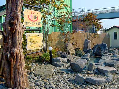 ミニ庭園とロックガーデンを組み合わせたような雰囲気の足湯で最近は屋根もついて準全天候タイプに進化した。湯船の周りに石造りのベンチが配置され、ホーム側にはすだれ、モミジなどの木も植えられ照明も凝った造で雰囲気だけなら此処が一番かも。バスや列車を待つ観光客や地元の方々などに利用されているが、年中使えるのが一番嬉しいことだね。