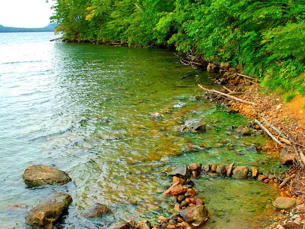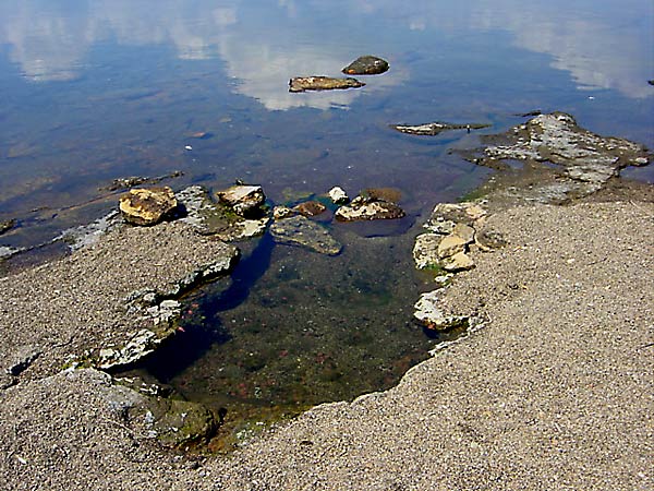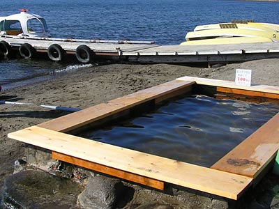 池の湯から道道52号を北上、池の湯入り口の約500m北側を左折し林道を湖畔に向かって進み、岸沿いに1分程歩くと砂地に湯溜まりが点在するが湖面と繋がっている小さな露天風呂が目指すイソノ湯。湖畔の露天風呂中最高の眺望だが2~3人限度の大きさ。看板等は何処にもないので根気よく探してください。最低でも穴掘用具と清掃具は必用となります。