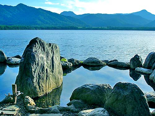 国道243号から川湯温泉方面に向かう道道52号に入り、約1km程の所にある有名な露天風呂。入り口に看板がありそれに従って進むと駐車場があり露天風呂はすぐ目の前。大きな石で囲まれた露天風呂は中央の大きな岩で男湯と女湯に分けているが、奥側でつながり実質的には半混浴でそれぞれ7~8人は入れる広さ。湯船から屈斜路湖までの距離はおよそ5m、ほぼ正面に中島、彼方に美幌峠を望む夕陽の綺麗な温泉。露天風呂は駐車場の反対側にある民芸店の方が管理されていて手入れが行き届いている。付近には宿泊施設3軒の他にアイヌ民族資料館がある。
