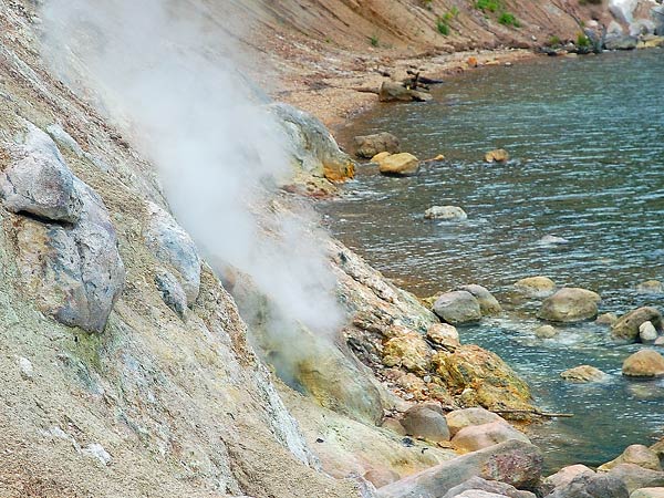 和琴半島の溶岩ドームはオヤコツ溶岩円頂丘と呼ばれ、安政5年に当地を訪れた松浦武四郎の日誌では岸から火が赤く見えたとある。北端のオヤコツ地獄には噴気孔群あり今も火山活動が続いていて、自然観察路途中の展望台がら見下ろす事が出来る。展望台から滑りやすい粘土質の斜面を下って湖岸に降りると崖の数カ所からにシューと噴気を吹き上げ湧出口は多いが、湯の湧出量はそれ程多くない。入浴するには石を囲んで浴槽を作らないといけないがカヌーのコースにもなっているので勇気がいる。夏場は高温の蒸気を利用して温泉卵がつくれるかもしれない。
