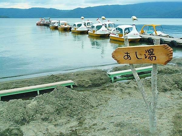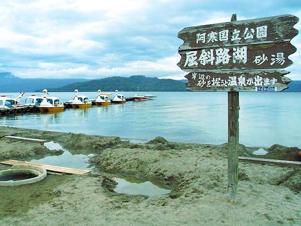 弟子屈町の露天風呂の中で最も風変わりなのが『砂湯温泉』文字通り湖畔の砂を掘ると、どこでも湯が湧き出しスコップがあれば自分専用の露天風呂を作る事も可能だが有名な観光地なのでそれなりの覚悟がいる、手軽なのは出来合いの足湯でしようか。食堂、売店と駐車場があります。
