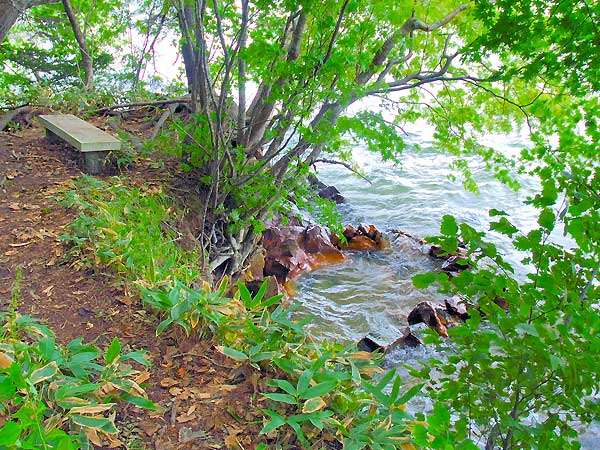 和琴半島の半島散策路を反時計回りに歩き公衆浴場すぎてまもなく遊歩道が二つに分かれ、直進でオヤコツ地獄、右折して湖岸に下るルートを取ると石のベンチが5個程有り、一番奥側ベンチの崖下付近が温泉の湧出口になります。湧出量はかなり多くて勢いよく湖に向かって自噴、湖水が入り放題の不完全な湯船でも、夏の波が静かな時なら適温。定員は2名が限度とおもいます。