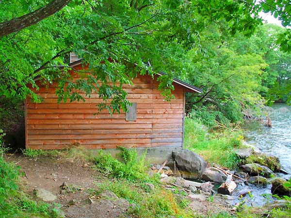 国道243号から道道52号に入り、約4km程の所にあるまつや旅館(閉鎖?)の看板があり、それに従ってまつや旅館ヘ向かって林道を進み、旅館を過ぎた先。温泉の目前に駐車スペースあり10台程度駐車可能。池の湯は大きな石で囲まれた直径15m程の円形をした深さも結構ある露天風呂。時には藻が繁殖しているが藻が体に良いと云う人もいる。湯温は38℃と低めで夏場限定ですが、国道から離れていて静かに過ごせる。旅館の裏側湖畔近くに松浦武四郎の歌碑が有ります。