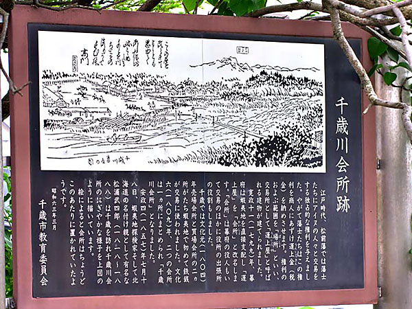 千歳川会所説明板より 『江戸時代、松前藩では藩士たちにアイヌの人々と交易をする独占的な権利を与えました。やがて藩士たちはこの権利を商人に預け運上金(税金)を納めさせます。権利の及ぶ範囲を「場所」といい、交易所として「運上屋」と呼ばれる建物がたてられました。寛政十一年(1799)年、幕府は蝦夷地を直接支配し「運上屋」を「会所」と改名します。「会所」は幕府の役人もいて交易の他に役所の出張所の役割もしました。千歳では文化元(1804)年、売場会所と買場会所がたち蝦夷地で初めて鉄銭が交易に使われました。文化6年(1809)二つの会所は1カ所にまとめられ「千歳川会所」となりました。安政4年、蝦夷地探検家そして北海道の名付け親として有名な松浦武四郎(1818~1888)は千歳を訪れ千歳川会所のにぎやかな様子を上図(説明板の上半分の絵)のように描いています。絵によると会所はちょうどこのあたりに置かれていたようです。昭和65年5月 千歳市教育委員会』千歳川会所とその船着場は、現在の千歳橋の近く、ホテルかめや(本町1丁目)のところにあった。◇所在地:千歳市本町1 ホテルかめや前nbsp;昭和54年に千歳神社が設置。 ◇N42°49’11.09” E141°38’49.31”