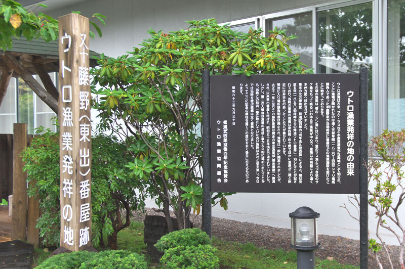 斜里町宇登呂の知床グランドホテル北こぶし敷地内にあり松浦武四郎顕彰記念碑と同時に建立されたようで、説明板では安政5年に当地に宿泊した松浦武四郎の日誌から引用している。説明板より転載『ウトロ近海は古来、サケ・マスなど水産資源豊かな海域として知られここに魚場が開かれたのは遠く天保年間(1830~44) シャリ場所請負人であった藤野家が当地前浜に番屋などの漁業施設を設けたことに始まっております、その頃の漁業は、春のニシン漁に始まり、夏のマス漁と続き秋のサケ漁をもって終わる三漁業が中心で、産物は北前船により遠く本州方面に移出されていました。幕末の北方探検家、松浦武四朗の「古い資料」によると彼は安政5年(1858) 知床岬からの帰途ウトロ番屋に一泊したことが記されており、当時の規模は梁四間・桁七間でほかに倉庫が二棟と附近には弁天社のあったことなどが書かれています。明治に入り場所請負制度は廃止され、魚場は一般に開放されましたが大正11年に至りこの藤野番屋は網走の東出漁業部(東出重蔵) へ譲渡され、以来東出番屋と呼ばれ、昭和55年頃まで遺されていました=以下省略=昭和63年9月30日 松浦武四郎没後百年記念協賛会 ウトロ漁業協同組合』安政5年当時はウトルチクシ(宇登呂)とホロベツ(幌別川付近)に番屋があり元々の規模は梁4間・桁6間だったようですが、ウトルチクシの番屋では秋田家が来るとのことで桁1間を継ぎ足し梁4間・桁7間にした(宿泊用の増設?)という。番屋以外ではウトルチクシに備米蔵と雑蔵、ホロベツには雑蔵と雇蔵があったという。通行屋を兼ねた番屋であったようです。◇所在地:斜里町宇登呂 知床グランドホテル北こぶし 前庭 ◇N44°07’21.49” E144°99’45.93”