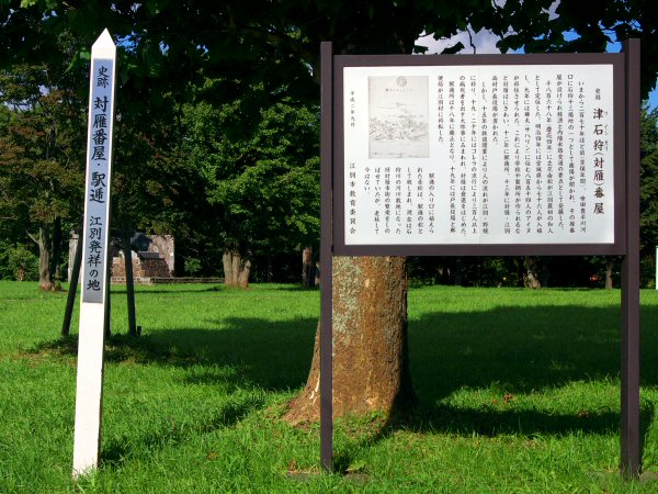 享保年間に石狩13場所のひとつとして商場が開かれ、その後番屋が設けられ鮭漁と石狩川を利用した内陸への交通と舟運の要所となっていた。駅逓所の開設は明治12年で翌年対雁・江別両村戸長役場が置かれたが明治15年の鉄道開通で市街中心地は江別や野幌に移る。主な輸送手段が舟運から鉄道に変わった明治18年に対雁駅逓所は廃止。また樺太アイヌが強制移住をさせられ、明治19~20年にはコレラの流行により、300人以上の犠牲者を出す悲劇にみまわれた歴史があり慰霊碑がある。碑は新石狩大橋に近い国道337号沿いの榎本公園に隣接、榎本公園は戊辰戦争で旧幕府軍として戦った榎本武揚の営んだ農場跡で榎本武揚の像があります。幕末の探検家、松浦武四郎は安政3年から安政5年までの間に当地には5回訪れ計6泊している。◇開駅:明治12年03月 ◇廃止:明治18年08月 ◇所在地:江別市工栄町 ◇N43°12’73.62” E141°51’51.04”
