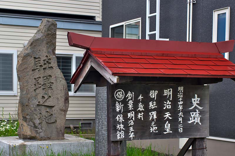 千歳川会所は明治2年11月の本陣から明治5年5月に駅逓取扱所(駅逓所)と変り駅逓から郵便業務が分離された。勇払場所請負人・山田文右衛門は請負で駅逓を勇払、白老、苫小牧、千歳、島松に設置、明治8年の漁場返上で石山専蔵が駅逓取扱人となるが、戸長就任で駅逓経営を離れるも再び取扱人となっている。駅逓廃止は明治22年以降、明治33年より前のようだ。郵便業務は明治5年に早くから千歳で旅館を経営していた新保鉄蔵が引き継いでおり、駅逓看板は千歳最初の郵便局(郵便取扱所)で有った事を示す千歳市有形文化財(個人所有-非公開)に指定されている。1806(明治39)年に再設置された官設千歳駅逓所の取扱人は新保福治でした。新保旅館創業者の新保鉄蔵は、宿泊者へのサービスと郵便業務のため馬を所有しており、繁忙期で駅逓所(旧千歳会所?)での手伝い、駅逓廃止後も駅逓と同様の仕事もしていたと云い駅逓開設の条件が整っていたのでしょう。前期、後期ともに千歳駅逓所や駅逓取扱人の碑はないが、関連碑としては明治初期の駅逓は千歳会所跡、千歳駅逓所跡は明治14年に明治天皇の北海道巡行時に新保旅館に宿泊したのを記念して昭和11年に建立された駐蹕之碑があるだけのようです。 ◇所在地:千歳市本町5 新保宅前 ◇N42°43’59.06” E141°38’57.89”