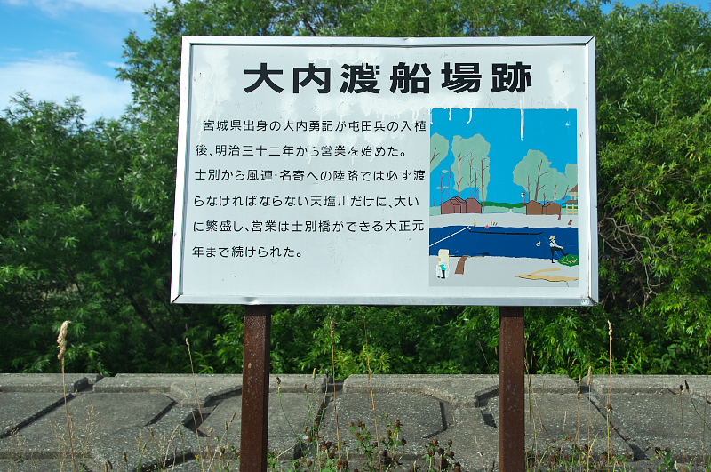 士別など音威子府以南の天塩川流域の開拓は道路開削と鉄道開削が相前後して進行する地域で、それ以前の物流や交通は川舟が主体で駅逓は基線道路(今の国道)が天塩川に突き当たる天塩河畔の左側にあり道を挟んで右側に士別最初の大内渡船場があったという。士別駅逓は取扱人の名をとって矢口駅逓と呼ばれていたというが鉄道が開通して明治35年頃に停車場通り角(現・士別市大通西7丁目)地に移転したよう(士別よもやま話より)ですが取扱人の詳細な資料は残っていないようです。経営実態の詳細も不明だが鉄道開通後も駅逓を営業していたのは上士別方面への需要があったためか? 今のぶどう公園付近一帯は駅逓牧場だったようです。河川敷や移転先を確認しましたが駅逓に関連する碑等はなく隣にあったという渡船場の説明板がありました。渡船場を営んでいた大内勇記は宮城県出身で1898(明治31)年につくも橋下流に越冬小屋をつ作ったとされる。◇設置年:明治33年06月◇廃止年:明治41年06月◇所在地:士別市北町 天塩川緑地公園