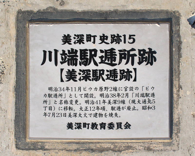 その後に建物を再建し旅館を続けられたようですが、その後は下宿や算盤塾などにも使われていたという。建物の明治年代という根拠は不明だが、駅逓看板は唯一残った駅逓の誇りだったのかもしれない。建物前の角地路面に美深町が史跡表示銅板を埋め込んであり駅逓跡で有る事を示している。国道沿いで美深町北四丁目の信号前の建物角地で冬期は降雪もあり確認は困難てしょう。美深町に明治期の建築物はないというのが公式見解のようです。◇設置:明治34年 ◇廃止:大正11年01月 ◇改称:明治38年02月 ピウカを川端に改称 ◇N44°29’09.0” E142°20’40.7”◇美深町大通り北5丁目