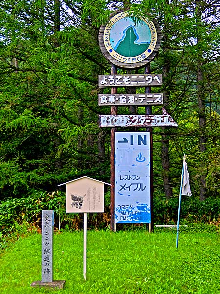 かつてニニウ集落であった真ん中を高速道路が貫通し、キャンプ場は廃止されている。そんなニニウの入口でサイクリングターミナルの広告塔と一緒に碑があるのは痛ましくもあり何とも皮肉な風景だ。駅逓時代は徒歩で越えたという鬼峠は既に廃道となり、占冠側にある鬼峠民有林道(本来の鬼峠ではない)の急斜度にその一端を垣間見る。説明板には「鵡川を渡り鬼峠を越えるこの地は陸の孤島の中のまた離島といわれ交通の不便なところであった」とあり「日本のチベット」とまで言わしめた秘境のような場所だった。駅逓は昭和20年に廃駅となっているが、廃止後は阿部旅館となり若干の日用品を扱っていたという。従来の道が占冠から鵡川沿いに続くがニニウで通行止で高速道路からの出入り口はなく今も孤島に等しい。◇開駅:大正06年12月 ◇廃駅:昭和20年09月◇初代取扱人:小林昇之助 ◇二代:三船留七 ◇所在地:勇払郡占冠村字ニニウ ◇GPS:N42°57’27.0” E142°19’50.6”