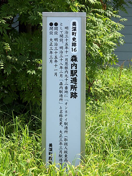 恩根内市街地端で恩根内大橋寄りの手塩川堤防近で松の木がある近くの民家建物脇に美深町が設置したオンネナイ(森内)駅逓所の史跡標示板がある。恩根内唯一の商店で民家は駅逓の建物と聞いたが、土台がコンクリートで建物は少し駅逓風ではあるが駅逓舎とは違うな印象だった。美深町史を見ると改築などをしているため形が変わっているが一部の骨組みなどはそのまま使われているとあり聞いたとおり駅逓だった。明治35年に美深まで達していた仮定県道が恩根内迄竣工、仮定県道とは云っても橋は殆どなく渡船頼りで、恩根内でも明治34年に恩根内大橋の少し下流側(恩根内16線)に官設渡船場設置が設置され遅れて私設の渡船場が根内18線に開設され小車方面への往来も便利になった。明治35年に開駅したオンネナイ(森内)駅逓所ですが、大正元年には鉄道が音威子府まで開通し、駅逓の役目を終えて大正3年に廃止された。駅逓跡は堤防に近い松の木が目印。◇設置年:明治35年12月 廃止年:大正03年03月 ◇改称年:明治38年02月 オンネナイを森内と改称 ◇初代取扱人:板東髙三郎 ◇所在地:美深町恩根内 ◇N44°35’42.9” E142°18’09.5”