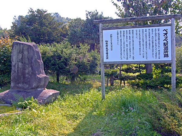 仁宇布には明治42年に数個が入植者がいるが、雄武町と美深町の中継地として明治45年に仁宇布駅逓所が開駅、昭和8年から蓮沼靖氏を取扱人として荷物などの運搬、宿泊所の役割を担った。駅逓は昭和18年に廃止、平成3年に美深町文化史跡に登録されていたが、建物の老朽化で維持が難しくなり解体された。駅逓の所有者だった蓮沼優裕さんは、駅逓跡に仁宇布駅逓所史跡のモニュメント建立し美深町に寄贈、モニュメントは高さ3.7m、幅4.1四m、奥行き1.4m、総工費は1244万円と駅逓の記念碑としては破格。仁宇布は未開通区間を残して廃線となった旧国鉄・美幸線の終着駅で、廃線後を利用したトロッコが運行されているトロッコ王国美深がある。◇設置:明治45年01月 ◇廃駅:昭和18年08月 ◇初代取扱人:矢敷和佐 ◇二代:蓮沼靖 ◇美深町仁宇布 ◇美深町文化史跡 ◇N44°32’42.10” E142°34’04.34”