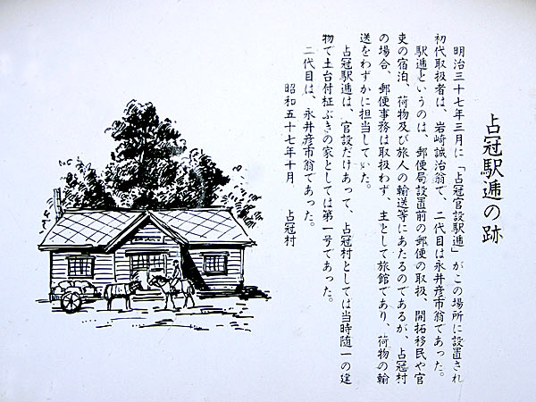 国道237号線と道道136号夕張新得線の交差点より占冠中央側に若干寄った青い屋根の物置と民家の間に碑と説明板(平成28年にはなし)があり脇にポールが立っている。駅逓の時代は占冠の中心地だったが鉄道駅や高速道路の普及で、今は占冠中央とトマムにその座を明け渡す形になっている。説明書きによると普通は郵便局開設前は郵便も駅逓が担当しているが占冠の駅逓は郵便の取り扱いはせず、主に宿泊(旅館)であり荷物の輸送を僅かにしていたとある。占冠駅逓所は上トマム駅逓所と下トマム駅逓所の中継駅逓でした。 ◇開駅:明治37年06月 ◇廃駅:昭和08年07月 ◇初代取扱人:岩崎勝治 ◇二代:吉田正美 ◇三代取扱人:永井彦一 ◇所在地:勇払郡占冠村字占冠 GPS:N43°00’15.7” E142°24’22.9”