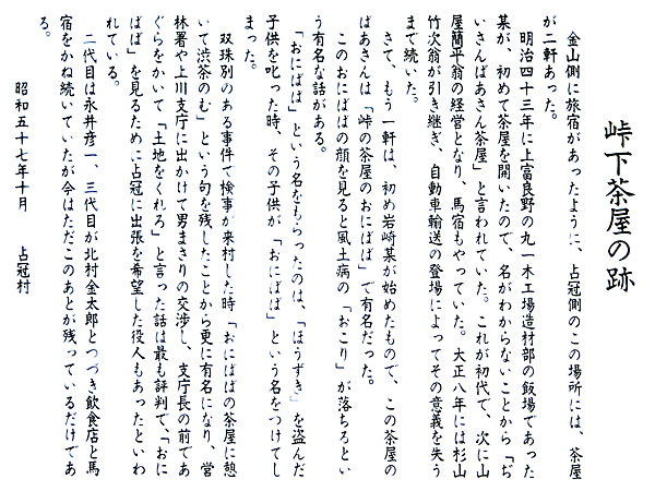 史跡説明板によると、金山側に旅宿が有ったように占冠側のこの地には茶屋が二軒有り、旅館と飲食店に馬宿となれば人馬継立もあっただろう。一件は明治43年に開設され「じいさんばあさんの茶屋」と呼ばれていたというが、その後経営者が変わり、3代目の経営だった時に廃止された。私設の駅逓そのものですが普通なら碑等は残らなかったと思うが岩崎某が開設した茶屋には「おにばば」という有名人がいて「おにばば」の顔を見ると風土病のコロリが落ちるとか、また「おにばば」見たさに占冠に転勤を希望した役人もいた、役人が泊まったという話も伝わる。官設駅逓が僅かの輸送しかしなかった背景にこの様な人達の存在があった。全文は写真で見てください。◇所在地:占冠村字占冠 金山峠 ◇GPS:N43°04’53.0” E142°23’41.1”
