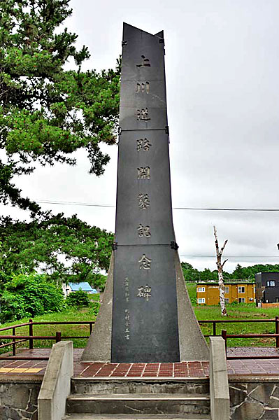 明治19(1886)年に国道12号の前身となる市来知~忠別太間の87.9kmの上川道路(札幌・岩見沢間は含めず)が着工され3ヶ月で仮開通、工事には樺戸集治監の囚人が駆り出された。翌年から本工事が開始され樺戸、空知集治監の囚人らが動員され明治23(1890)年に全線開通。軍用道路という性格を併せ持っていた事もあり人力による突貫工事で多くの囚人達が犠牲になった。開道百年を記念して昭和44(1969)年に空知太神社境内に、囚人の慰霊のため砂川市と北海道が「上川道路開鑿記念碑」を建立しているが、当事者の北海道が犠牲になった囚人の為に建立した碑は他にしらない。◇撮影地:砂川市空知太 ◇GPS:N43°32’35.38” E141°55’11.73”