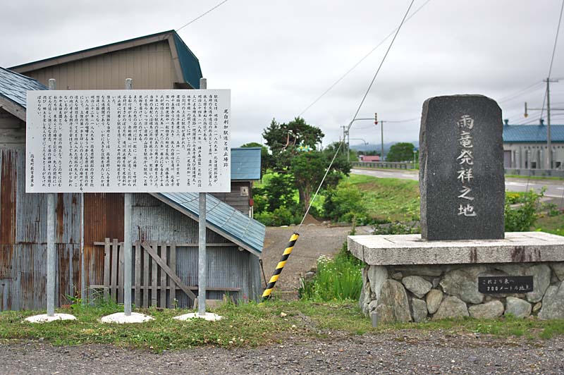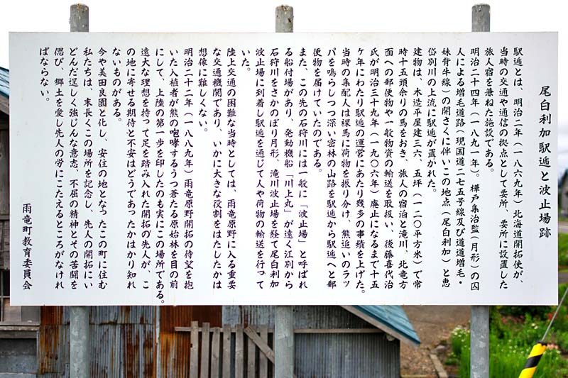 明治24年、増毛道路の開削にともない尾白利加駅逓が置かれ滝川、増毛方面への物資や郵便物の輸送を取り扱っていました。旧増毛道路は現在とは違いオシラリカよりほぼ直進し恵岱別川の手前から恵岱別川右岸側を西に向かっていた。尾白利加駅逓所は尾白利加川の河口近くの北側にあり、増毛道路開削に使われた囚人の宿泊小屋が駅逓舎として利用されたというが、国道と堤防道路がY字形交差している所(後藤橋付近)にあった説明板とハト場跡は撤去され、北200m程の距離にある雨竜町発祥の地に移動して再建されている。駅逓取扱人の後藤喜代治は同時に恵岱別駅逓の取扱人だったが恵岱別駅逓は代理人をおいていたようです。江竜橋(旧橋の有った方)のたもとには伏古渡船場跡の記念碑がある。。 ◇開駅:明治24年06月 ◇廃止:明治39年06月 ◇初代取扱人:後藤喜代治 ◇所在地:雨竜町字尾白利加83-3 ◇GPS:N43°37’24.0” E141°52’50.1”