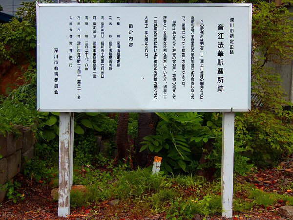北海道庁の命を受けた高畑利宜は樺戸集治監の服役者を使い旭川までの仮道路を作った。その高畑利宜が役人を辞して明治22年に開設した5駅逓の一つで音江法華駅逓所-第2美英舎と名付けられ、上川街道の中継点として人馬を備え、宿泊と運送の便をはかった。建物には本館をはじめ、きゅう舎などの付属施設がありました。説明板は国見峠へ向かう市道(旧上川道路)わき、敬徳寺斜め向かいにある。国見峠展望公園の視界は以前と比べると良くない。 ◇設置:明治22年04月 ◇廃駅:大正11年07月 ◇初代取扱人:高畠利宣 ◇二代:沼田覚兵衛 ◇三代取扱人:山本弥太郎 ◇四代:疋田与惣治 ◇五代取扱人:高橋惣吉 ◇所在地:深川市音江町1丁目12番22号 ◇N43°41’52.38” E142°04’46.74”