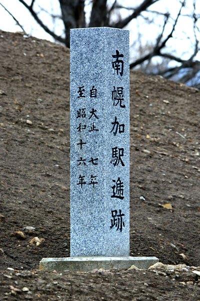 南幌加小学校跡より数百メートル手前で右折し、徳富ダム方向に進み徳富川を越えて道路がカーブし登りにさしかかる所で左法面に中程に碑がある。北海道宿駅制の研究より碑の方が一年早い開始年となっており民営の期間があったものか?この先は農地の再開発と現場関連の事業所があるだけで無人地帯。碑の位置は見上げる高さにあるので離れた距離から見た方が探しやすいかもしれない。付近の白樺林は元々は水田だったようで段々となっていた。◇開駅:大正08年02月 廃止:昭和16年10月 ◇初代取扱人:菊田馨太郎 ◇二代取扱人:菊田清兵衛 ◇現住所:新十津川町南幌加 ◇GPS:N43°33’53.77” E141°40’54.62”