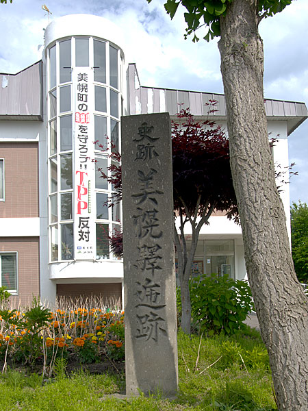 明治30年に美幌、木禽、活汲の各原野測量され、明治31(1898)年頃より入植者がはいり開拓がはじまっている。明治33年になって駅逓が設置されているが、網走や女満別方面から美幌、津別を経て釧路・阿寒.十勝に至る主要な通路で有るとともに、北見への分岐点にもなったこともあって利用者は多かった様です。弟子屈には杵端辺を経由して峠を越える道が古くからあったようです。駅逓舎は大正2年に焼失し大正5年に新築移転している。碑は美幌町役場敷地内にあるが、石碑のみで説明板などはなく碑も人目に触れることが少なそうな所にあるのは残念。市街地にあるのでもう少し配慮があっても良さそうに思う。