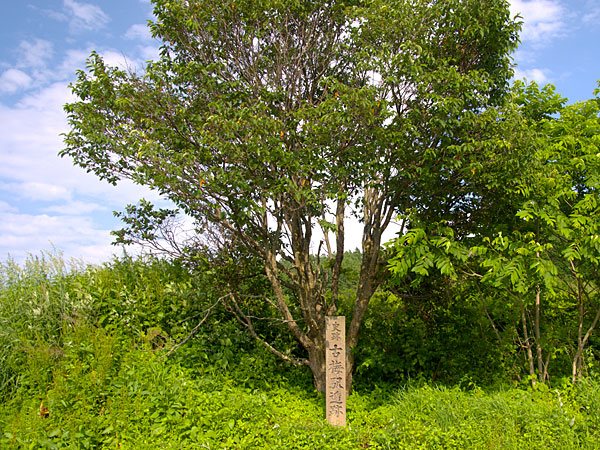 碑文には「山本馬之助が取扱人となり杵端辺(ケネタンベ)駅逓として開所する。道内を旅する人達を宿泊させる」とある。駅逓跡は国道駐車帯際から大回りするように伸びた旧国道(町道864号)沿いで、国道からは桜の木が目印になるが、春以外では注意していないと見落としてしまう。地主さんの話によると「今では不整地となっているが元々は平坦な地形」という。流土を止めるため盛り土にしてしまったようです。杵端辺駅逓(通称・古梅駅逓)跡の碑は美幌町教育委員会が昭和53年11月03日に建立した設置したもの。