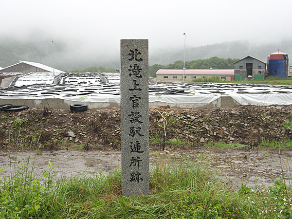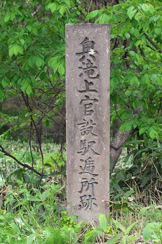 滝上町市街から国道273号線で上川方へ向かうこと約20km、最於くの集落跡に残る閉鎖された空店舗を下りカーブを過ぎて道路左側に「奥滝上官設駅逓所跡」の石碑が設置されている。その横に門柱らしき木柱があるが、かつてあったという学校の校門かもしれない。碑に駅逓は「ここより此処より北方50メートル」と駅逓の有った場所を記してある。この地域で開拓が始まったのは大正2年、大正7年には戸数45戸、市街地が形成され学校も出来て人々が暮らしていたが、その痕跡も殆ど失せて今は無人の荒野と化している。道路は昭和9年に上川まで開通しており、峠越しのため駅逓制度廃止まで残っていた7駅逓のひとつでした。