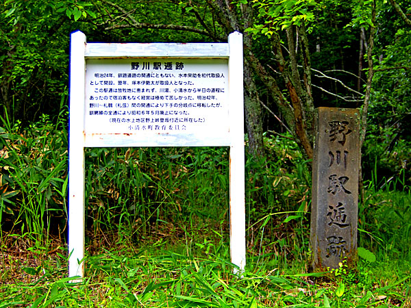 国有林の中を野上峠に向かって進んで行くと、道路の右側に一段低い少し開けた湿地状の草地奥に人知れず碑と説明版がある。以下は小清水町教育委員会が立てた説明板より「明治24年、釧路道路の開通に伴い、水本栄助を初代取扱人として開設。翌年、塚本伊勢太が取扱人となった。この駅逓は放牧地に恵まれず、川湯、小清水から半日の道程にあったため宿泊客も少なく経営は極めて苦しかった。明治42年、野川~札鶴(札弦)間の開通により下手の分岐点に移転したが、釧網線全通により昭和6年5月廃止になった。(現在の水上地区野上峠登坂付近に所在した)小清水町教育委員会」、最初の開設地であり痕跡は皆無、今は説明板と石碑だけ。ここは放牧地に恵まれず斜里の方で放牧をしていたが大雪で官馬や私有馬を失う事が繰り返され駅逓経営は大変だったようです。四代目取扱人、小宮山捨蔵のときに移転している。2代目野川駅逓管理人であった岩手県人の塚本伊勢太氏は明治30年に神威10線21号に転住入地しており、そこに清里発祥の地碑があります。