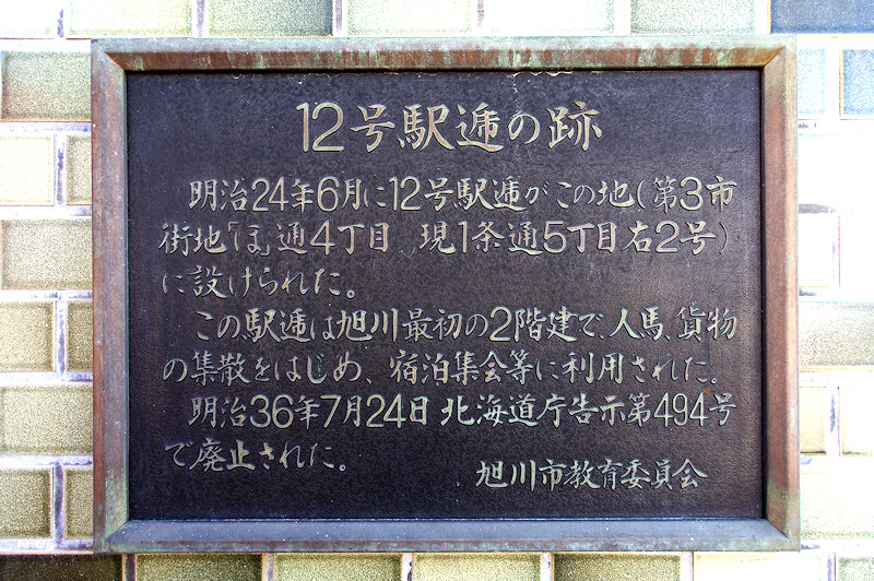 十二号旭川駅逓所跡の碑はなくワークショップ旭川(品田商店)の店舗外壁(自動販売機横)に史跡プレートが固定されてあるだけ。当時の紀行録「北見紀行」では「字小春 永山村の属地にして北見新道の駅所也。石狩川端也。北見新道、則中央道路は小春迄駅伝十一あり、則小春は十一号駅伝たり。当舎の外人戸弐戸あり」となっており実質的な起点が小春(伊香牛)という様子で書かれていて、この頃は旭川駅逓での人馬継立はまだ始まっていなかったようにも受け取れる。明治36年頃は下愛別駅逓所との間に必富官設駅逓所(現・比布町)と渡し場があったというが場所は不詳。旭川駅逓所は明治36年に廃止されている。 設置場所:旭川市1条通5丁目右2号 ワークショップ旭川