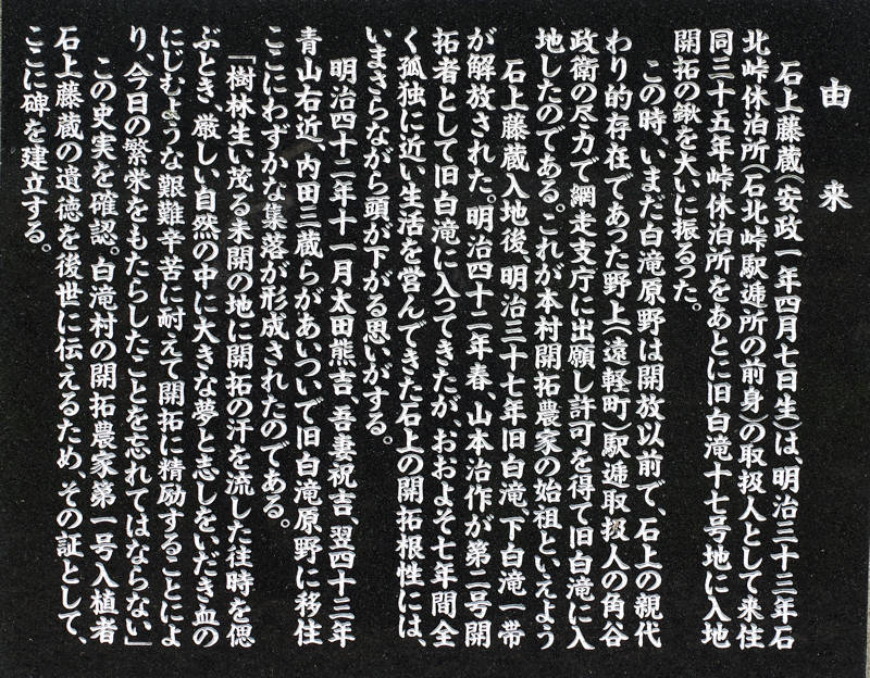 石上藤蔵氏の入植100年を記念し関係者によって平成8年に建立された碑で北泉農場前にある。『由来 石上藤蔵(安政1年4月7生)は明治33年、石北峠休泊所(石北峠駅逓所の前身※峠駅逓所の事)の取扱人として来往、同35年、峠休泊所をあとに旧白滝17号地に入地開拓の鍬大いに振るった。この時、いまだ白滝原野は解放以前で、石上の親代わり的存在であった野上(遠軽町)駅逓取扱人であった角屋政衛の尽力で網走支庁に出願し許可を得て旧白滝に入地したのである。これが本村開拓農家の始祖といえよう。石上藤蔵入地後、明治43年春、山本治作が旧白滝に入ってきたが、おおよそ7年間全く孤独に近い生活を営んできた石上の開拓根性には、いまさらながら頭が下がる思いがする。明治43年11月太田熊吉、吾妻祝吉、翌年43年、青山右近、内田三蔵らがあいついで旧白滝原野に移住、ここにわずかな集落が形成されたのである。「樹林生い茂る未開の地に開拓の汗をながした往時を偲ぶとき、厳しい自然の中に大きな夢と志しをいだき、血のにじむような艱難辛苦に耐えて開拓に精励することにより、今日の繁栄をもたらしたことを忘れてはならない」この史実を確認。白滝村の開拓農家第1号入植者石上藤蔵の遺徳を後世に伝えるため、その証としてここに碑を建立する。』