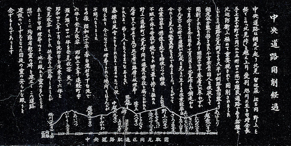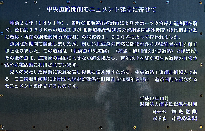 中央道路は政府の北辺警備と北見地方の開拓促進のため明治19年に着工され、明治24年に完成された札幌、旭川、網走、釧路を結ぶ当時の大動脈でした。このうち、明治24年4月から同年12月にかけて集治監網走分監の囚徒を1970人使役して工事を行いました。網走、中越間163.7kmの開削では難工事を極め激しい労働と栄養失調のため238人に及ぶ死者を出しております。この場所は、仮監跡で67体が仮埋葬されておりましたので、昭和33年46体を発掘いたしまして供養を続けてまいりましたが、未だ21体地下に眠っております。こうして北見地方開発の【判読不能-労を担った-か?】犠牲者をこのまま放置したのでは忘れられ霊が浮かばれないのではないかと思いつき、暗い歴史は歴史として真実を後世に残すのが70年代に生きる私達に果せられた義務と考へ、囚徒の霊の安らかに永眠されることを祈念いたし、ここに46体の遺骨を納め地下に眠る21体と合わせて殉難慰霊碑を建立するものであります。 昭和五十一年九月 瀬戸瀬婦人会」