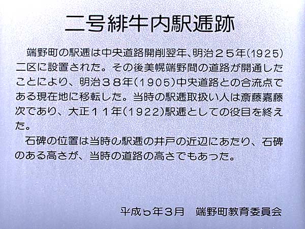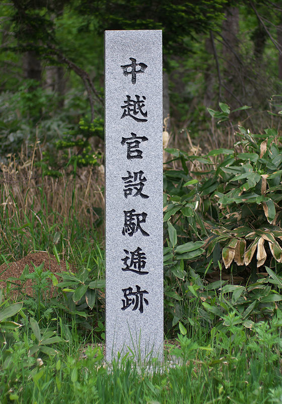 中越駅逓の名称は上川市街裏にあるアイヌ語のルベシベを意訳した越路駅逓と上越の北見峠駅逓の中程にあり中越となったようですが中越に峠は無い。上越には9年、中越には18年、知刈別では昭和9年の廃駅まで17年の期間でした。開設当初は宿泊者は少なく明治30~40年代になって増加し大正年代になって減少傾向で経営は厳しかったようです。建物は記録では36坪5合とあり当時としては平均的な駅逓舎で官馬は三頭とあった。碑は第二次と第三次中越駅逓跡だけで上二股にはない。