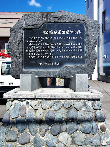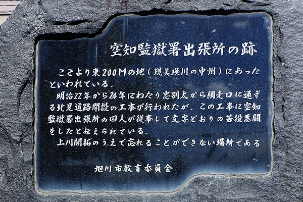 碑は道道90号旭川環状線沿いの神居交番前に碑がある。以下碑文より「ここより東200Mの地(現美瑛川の中州)にあったといわれている。明治22年から明治24年にわたり忠別太から網走口に通ずる北見道路開設の工事が行われたが、この工事に空知監獄署出張所の囚人が従事して文字通りの苦役悪闘をしたと伝えられている。上川開拓の上で忘れることができない場所である。旭川市教育委員会」碑文では網走口とあるが、空知監獄署出張所は明治22年に旭川から北見峠を越えて遠軽を経て湧別まで仮道路を開削、湧別からは海岸沿いに既成の北海道を補修して網走までを約3ヶ月で到達した。翌年は改修工事で伊香牛までを担当、囚人不足で伊香牛から現上川町上越までの区間は請負業者が施行している。