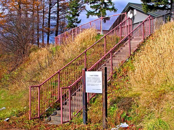 この中央道路は明治22年計画着工となっているが、明治22年に空知監獄署の囚人を動員して仮道路が湧別経由で網走まで完工しており、明治23年に改修工事(本工事)に入るが、このときは囚人不足で忠別太から伊香牛まで、伊香牛から上越までは業者、佐藤倉吉の請負で改修工事をしている。そのルートは伊香牛を過ぎてからは石狩川の右岸沿いを通り愛別の難所、安足間を避け(ここを通ると大きな橋が二カ所必要になる)てエチャナンケップ川筋から越路峠(上川公園)を経て留辺蘂川筋に抜けた。碑には「旭川に空知監獄署出張所が開設され、北見道路開設の工事に囚人が従事した」とあるが、囚人使役の実態は不明、上川側の区間に関しては、北見側の様な囚人酷使は伝えられていず道路工事の犠牲者が公式記録として残っていないだけで、空知監獄署は2年間で180人以上の死亡者を出しており、この中に上川道路に動員された犠牲者(54人?)が含まれているようで犠牲者は多かったようです。 ◇設置場所:上川町字越路・上川公園。 ◇GPS:N43°51’24.46” E142°46’05.80”