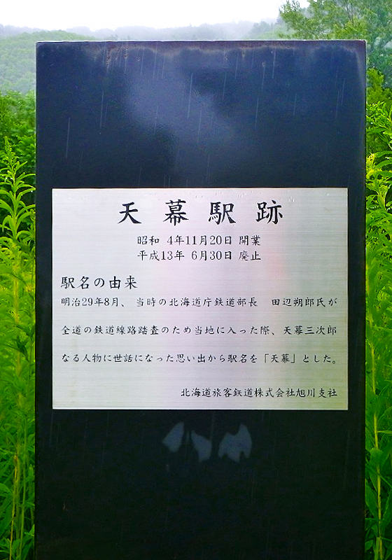 ここには天幕駅跡の説明板があるだけですが、天幕という名前についてはいくつかの説があるが一番有力なのが「清水三次郎が天幕を張って暮らし、自称天幕三次郎と名乗った」とする説。「愛別町史」や「国沢歴蔵自伝」によると本名を清水三次郎といい明治23(1890)年頃からこの地に定着し猟業を生業としていたようです。明治29年8月に北海道庁技師の田辺朔郎が鉄道敷設調査のため旭川からルベシベ河畔(天幕)に至った時、小屋を調査隊に供し自らは天幕を張って過ごしたという。その事が縁で鉄道が開通した時に駅名を天幕と命名されたようです。明治30年頃になると広い家を建て馬を数頭飼い私設駅逓もしていて繁盛していたようですが、明治36(1903)年に家を棄て駆落ち、逃避行先の六号野上駅逓で働いていたが、そこをやめて瀬戸瀬の隠れ沢に移り、再び猟業の生活に入りそこで亡くなったという。田辺朔郎は後に2代目道庁鉄道敷設部長を経て京都帝大教授となる。天幕は木工場や天竜鉱山付属精錬所でそれなりに繁栄したという集落だったが今は無人化しリサイクル施設が近くにあるのみ。◇上川町天幕