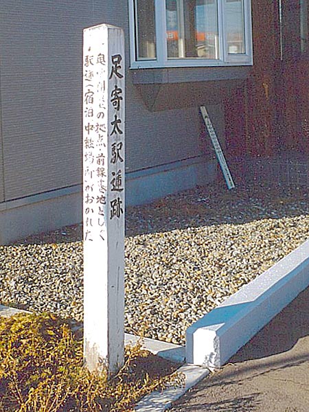 明治36年開設の足寄太駅逓所は平屋の建物で元々は芽登街道の入口付近に有ったが、明治43年の鉄道開通で市街中心部が北に移動したため同年秋頃に駅逓も神社入口の市街に移設された。駅逓の経営は明治38年に帯広の上田喜七に引継れている。駅逓は大正3年年4月10日付で廃止(北海道宿駅制の研究では大正14年)されたという。標柱の有る所は個人住宅の一角で神社(西町)とはかなり距離があり地元の方でも知っている人にであわなかった。再訪時に碑は確認出来なかったが継続して掲載した。◇開駅年:明治36年04月 廃駅年:大正14年11月 ◇初代取扱人:野村文吉 ◇二代:大西喜三郎 ◇三代取扱人:上田喜七 ◇現住所:足寄町南7条1丁目1番