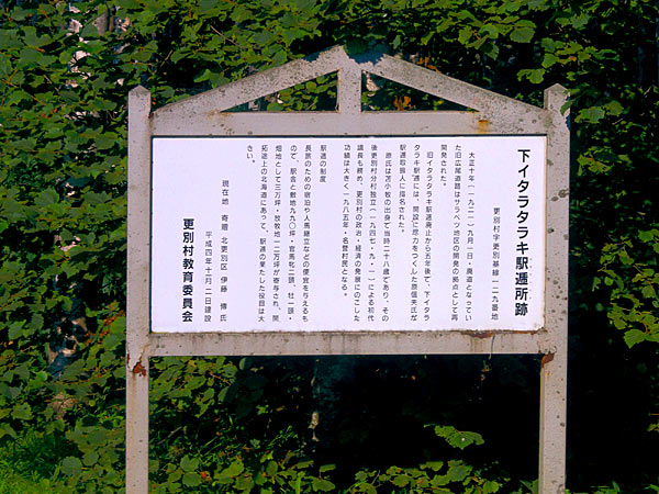 碑と説明板は更別町が設置したもので道道更別幕別線沿いの東和橋付近にある。碑裏面の碑文「明治30年、更別原野に始めて道路が開通し、ただ1箇所の駅逓が設けられ更別村開発における最初の拠点となった地点としてここに印す。昭和47年9月、開村25周年を記念して建立する。」 イタラタラキ駅逓所跡説明板「更別村字勢雄454番地1十勝は明治29(1896)年植民地開放となり、下帯広(現帯広市)が十勝の中心として位置づけられて来た。しかし、道路は大津から一本道のみで、十勝川流域は舟便に頼るしかなかった。明治30年帯広から十勝で最も古くて当時繁栄を誇っていた、広尾に至る仮定県道を設けることになり、途中札内川、日方川など川幅の広い所は渡船とし、道路巾を12間として側溝がほられた。この仮定県道の中間地点にイタラタラキ(以平)駅逓が、滋賀県野洲郡中洲村出身の吉川茂吉氏が取扱人となり、人跡未踏の原野に明治31年4月1日開設された。大正3年(1914)拓殖道路が仮定県道に編入され、大正5年・イタラタラキ駅逓はその歴史的任務を終えた。 ◇現在地寄贈 東栄区 丹治 久氏 平成4年11月2日建設 更別村教育委員会」 ◇開駅:明治31年04月 ◇廃駅:大正05年02月 ◇所在地:更別村字勢雄454番地1 ◇N42°38’28.3” E143°51’36.5”