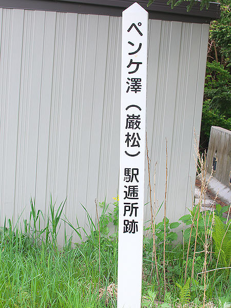 十勝川上流での造材や昭和14年着工の岩松ダム工事などで人の往来も盛んで、大正15年に官設駅逓所としてペンケ沢に開設された。取扱人は岩野浅次郎氏で官馬2頭と宿舎42坪を有し、別に牧場として55町歩を所有していた。昭和18年に廃駅なるが民営で昭和23年まで運営されていたとの事で北海道最後の駅逓かも。昭和61年に「ペンケ沢駅逓所跡」史跡標柱が新得町により設置されている。史跡標柱は道道718号線沿いのペンケニコロベツ林道入り口と道を挟んで民家脇にあり最近更新されたようです。隣に「上川灌漑遺構」の史跡説明板がある。 ◇開駅:大正15年03月 ◇廃駅:昭和18年08月 ◇初代取扱人:岩野浅次郎 ◇現住所:新得町岩松 ◇N43°10’23.6” E142°55’02.3”