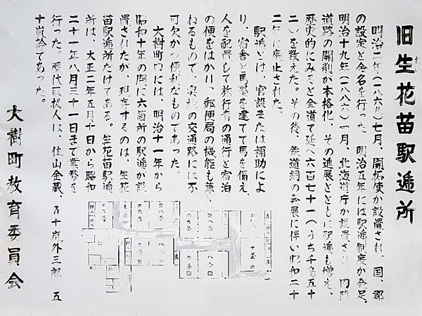 官馬4頭が備えられ広尾・大樹・牛首別をつなぐ十勝最後の駅逓。駅逓の建物は同所の五十嵐商店の敷地内に有ったが、『九年前の地震(その前にも地震で被害があって九年前の地震で完全に倒壊したという)で、駅逓も店も倒れてしまって大変だった、倉庫がある部分は元の商店で、店のある所が駅逓だった』と店主、五十嵐さんが当時の事を説明、駅逓舎はそのに時撤去したとの事で痕跡はない。大樹町の説明では史跡説明板もその時に撤去されたとの事だったが、嫁さん曰く『長年の付き合いで(史跡説明板の事)愛着があり捨てられなかった』と、現在は五十嵐商店の倉庫に掲示している。大樹町では復元が可能なように設計図はとってあるというが、今のところ復元の予定はないらしい。大樹町に有った6駅逓(佐藤嘉兵衛駅逓所跡は除く)の中で唯一正確に場所が分かっている駅逓とも云う。◇所在地:大樹町字生花778番地 ◇ナウマン国道沿い:五十嵐商店敷地内 ◇N42°35’52.8” E143°27’11.1”