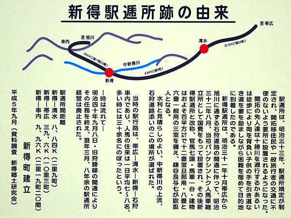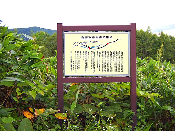 明治31年11月に帯広から旭川へ通じる道路(旧石狩道路・落合~串内~峠~パンケシントク~広内~清水(ペケレベツ)で串内や広内の林道は旧道のの一部)が開かれ、新得8号線との合流点に官設パンケシントク駅逓所が開設されている。パンケシントク駅逓所は官馬7頭に馬車1台を保有して運営され、明治33年に新得駅逓所と改称。部屋は旦那衆用12畳1室で一般の旅人には開放しなかったと、また一般用として6畳、8畳それぞれ1室の3部屋があったという。オダッシュ山登山口方向に進みオダッシュアンダーパスを潜りぬけ直進、突き当たりを右折するとまもなく左手にオダッシュ山登山口、その登山口を通り越し300m程進んだ右手に新得町が昭和58年に設置した「新得駅逓所跡の由来」標示板がある。この林道は春先ならば徒歩でなら串内に抜けられ(串内牧場の許可は必要)るようです。◇開駅:明治32年08月 ◇廃駅:明治41年02月 ◇初代取扱人:鎌谷与七 ◇所在地:新得町広内8号? ◇N43°04rsquo;06.0” E142°46’12.6”
