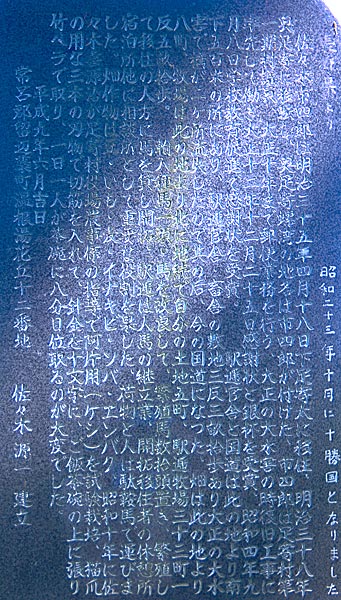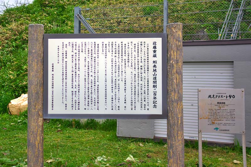 音更山道(現国道)は明治25年釧路監獄の囚人によって切り開かれた囚人道路の一つであるが馬車が通れるような道ではなかった。そこで大正七年に王子製紙や関木材が元小屋から造材現場のメトセップ沢までの10kmを延6千人の囚人を酷使し馬車が通行可能な道(元は音更山道と呼ばれていた)を3ヶ月の突貫工事で完成させる。石碑はこの道の開通を記念して十勝監獄が建立したもので、士幌線の工事で音更川に放置されていたのを、1970昭和45年国道工事の際に再設置。◇種類別:有形文化財 ◇指定日:H9.6.13 ◇所在地:上士幌町字黒石平75番地 国道際”
