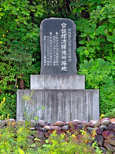 足寄太から右に折れて4里の螺湾駅逓は43年4月10日の開設、大正13年頃廃止された。碑文(裏面)によると『螺湾という地名は佐々木市四郎の命名という。また旧国道と駅逓官舎はここから南下500mの所に有ったと云うが、大正の大洪水で橋が流出し国道が今の位置に移動した』と有るので、正確には碑が有る所は駅逓の牧場内だった事になるが誰の目にも触れないところに設置するよりは賢明と思う。碑は佐々木市源一氏が平成九年に建立されたものです。 ◇開駅:明治43年05月 ◇廃駅:昭和11年12月 ◇二代取扱人:佐々木喜源治