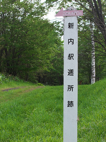 明治31(1898)年~明治32(1899)年に開削された旧石狩道路(十勝国道とも)は落合~串内~パンケ新得~広内~清水石山を通る道で十勝越え、石狩越えとも呼ばれたが、明治40年に日本国有鉄道の落合駅~帯広駅間が開通して旧石狩道路の通行は減少、狩勝ルートは昭和6(1931)年に開削され昭和27(1952)年に国道38号に昇格。狩勝峠の呼称は北海道官設鉄道の鉄道敷設部長田辺朔郎がルート選定のために佐幌岳周辺を踏査した際に旧石狩国・旧十勝国から一文字ずつ取って「狩勝峠」と命名しという。通称・狩勝線のトンネルを抜けると眼下に十勝平野を一望でき「日本三大車窓」の1つとされ、狩勝(鉄道)峠が昭和2(1927)年には「日本新八景」に選定され往来する旅人も増え、昭和3年に時の村長、佐藤伊久馬氏が河西支庁長(現十勝支庁長)に請願し翌昭和4年に新内官設駅逓所が設置されたもので、観光誘致的な目的を含み従来の駅逓とはやや趣を異にする。取扱人は福本義雄氏で、官馬1頭、私馬4頭、馬車1台、建物約約165平方mを有していた。昭和6年に新内から落合に通じる新道が開通、既に鉄道が開通している事もあり昭和31年に廃駅、その後は新内郵便局として再設置された。昭和41(1966)年に狩勝線区間は急勾配をなど緩和した新狩勝トンネルを経由する新線に変わり新内駅も廃駅、昭和54(1979)年まで狩勝実験線として使用された後の集落は離散、消滅。旧新内駅は旧狩勝線ミュージアム、蒸気機関車(59673号)、国鉄特急形寝台客車(20系)の展示、エコトロッコ基地として公園となり、新内駅跡を経て旧狩勝トンネルに至る約17kmが旧狩勝線フットパスとして整備されている。旧新内駅前(今の新内駅カフェ裏)に「新内駅逓跡この先80m」の標柱がある。旧新内駅前から直線の林道(旧道)を下っていき、直線の終る所が新内駅逓所跡。新内駅逓所の廃止後は郵便局だったというかつての小市街はその痕跡もなく自然に戻っている。◇開駅年:昭和04年10月 廃駅年:昭和13年09月 ◇初代取扱人:福本義雄 ◇所在地:新得町新内西5線 記念碑:史跡標柱 ◇N43°15’87.89” E142°81’43.11”