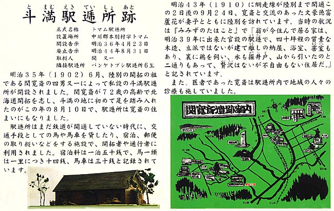 駅逓官設当時は十勝国中川郡本別村字トマムで、関又一氏が入植した明治34年から私設駅逓所として設置されていた。官設駅逓所としては明治36年4月23日~明治44年8月31の営業で駅逓取扱人は関又一氏、駅逓所として施設が整ったのは明治39年頃のようで建坪は40坪(132平方メートル)という。隣接する駅逓所は、パンケトブシ駅逓所(取扱人は関農場開設に協力した藤森弥吾吉氏)で約24kmである。関寛斎の住宅でもあった斗満駅逓所跡に陸別町の設置した説明板が有り、比較的近くに関寛斎氏を訪問した文豪・徳富蘆花の歌碑も有る。陸別オーロラタウンには関寛斎資料館が有り駅逓設置場所も聞くと教えてもらえるでしょう。陸別オーロラタウン前に銅像が建立されている。◇開駅:明治36年04月 ◇廃駅:明治44年08月 ◇初代取扱人:関又一 ◇現住所:中川郡本別町字斗満 ◇N43°27’31.3” E143°43’42.6”