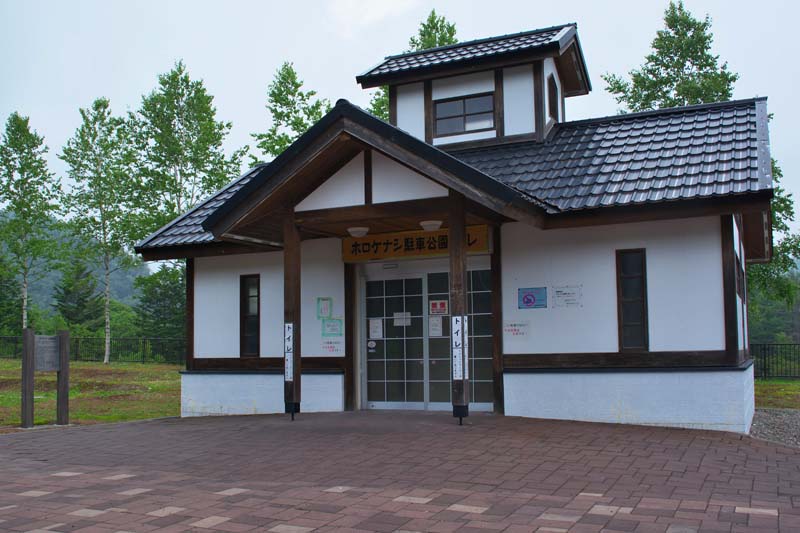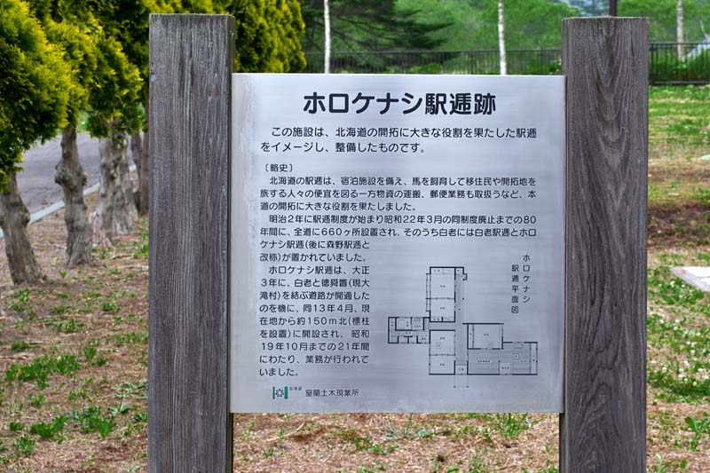 「明治22年に駅逓制度が始まり昭和22年3月の同制度廃止までの80年間に、全道に660ヶ所設置され、そのうち白老には白老駅逓とホロケナシ駅逓(後に森野駅逓と改称)が置かれていました。ホロケナシ駅逓は、大正3年に白老と徳舜瞥(現大滝村)を結ぶ道路が開通したのを機に、同13年4月現在地から150m北(標柱を設置)に開設され、昭和19年10月までの21年間にわたり業務が行われていました」この場所から150m北のところが駅逓があった場所という。 ◇沿革と歴代取扱人 ◇開駅年:大正13年04月 ◇廃止年:昭和19年10月 ◇駅逓取扱人:曽根一 ◇記念碑:モニュメント ◇所在地:白老町森野 ホロケナシ駐車公園 ◇N42°63’25.85” E141°24’73.88”