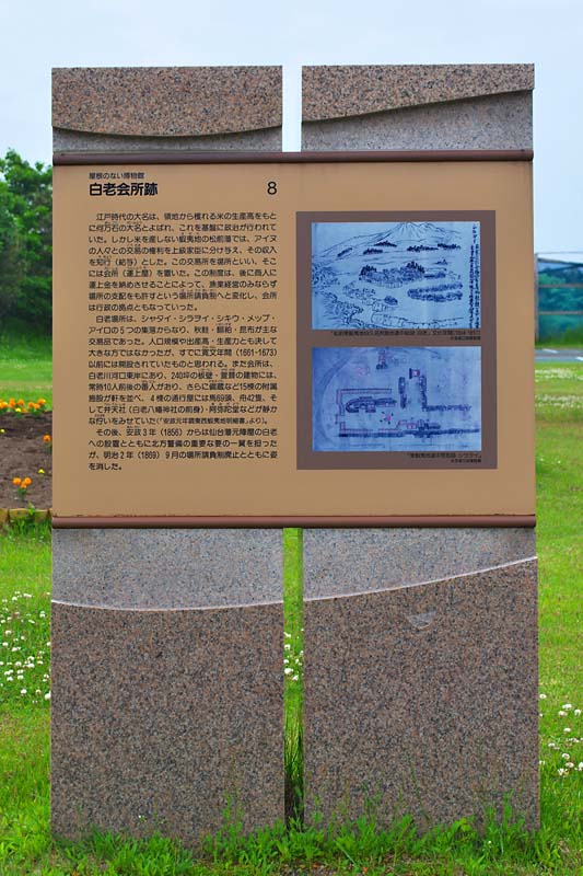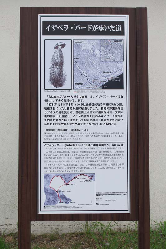 開拓使が引き継いだときの駅逓取扱人は大沢周次郎となっています。会所の時代からの駅逓は引き継がれてきた訳ですが詳細はわかりません。またイザべラ・バードがこの地を通過した明治11年の記録では「本道脇の白老駅逓で百頭以上の馬の群れが走る音で目覚た」「非常にきれいな新しい宿屋で部屋も快適」とあり、駅逓は札幌本道の開通した明治10年頃に本道脇に新規移転(北海道宿駅制の研究では明治7年)していたようです。明治14年に明治天皇が北海道を巡幸した際、大沢周次郎宅(駅逓)を行在所(宿泊所)として使用したというが大沢宅は火災で焼失、後に大沢宅敷地内に明治天皇巡幸の記念碑が建立されが、今は白老神社に移されている。駅逓は今の三好商店とカネイ佐藤商店のあいだの空き地にあったという。廃駅年は不明だが明治34年前後と推測されている様です。すぐ近くの「しらおい創造空間・蔵」の道路沿いにイザべラ・バードの説明板があります。◇所在地:白老町本町1丁目4番地~5番地?