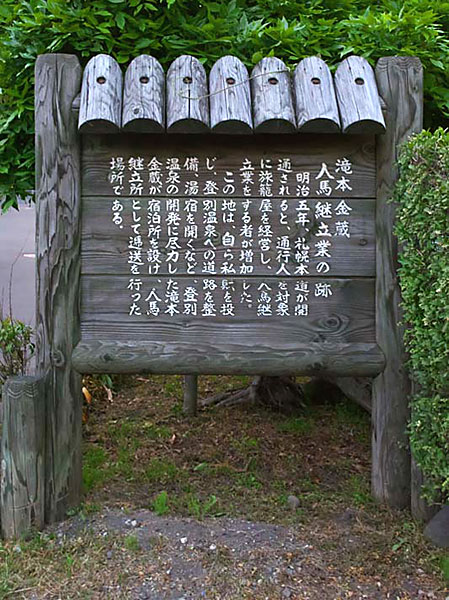 明治6年、札幌本道(現登別小学校の前の通り)が開通すると、通行人を対象に旅籠屋(はたごや、旅館)を経営し、人馬継立業をする者が増加した。滝本金蔵は私財を投じ登別温泉への道路を整備、湯宿を開くなど登別温泉の開発に尽力した。この地は滝本金蔵が宿泊所を設け、人馬継立所として逓送を行った場所。◇沿革と歴代取扱人◇開駅年:明治6年 ◇廃止年:詳細不明 ◇初代取扱人:滝本金蔵 ◇所在地:登別市登別本町2丁目3番地3