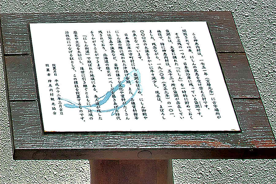 『ここ神恵内村は、1751(宝暦元年)年に古宇場所が開設されて以来、にしんの恩恵を受け栄えた村です。その名残の一つが、日本海沿岸に残っている袋澗です。袋澗とは、大量に採れた「にしん」を一時的に貯めておく施設で、特に神恵内村は53ヶ所の袋澗が存在してました。残念ながら、1920(大正9年)年の101,000石の大漁をさかいに年々減少し、現在は幻の魚となっています。