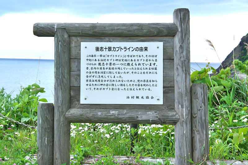 国道229号線沿いの照岸にレストハウスワン・ツーがあり、裏手の海岸段丘上にカブトラインの碑が建っている。夕日の名所との噂もあるが、眼下に照岸海岸の袋澗群を望める場所としてはカブト千畳の駐車帯とともに絶好な位置、観光だけで無く近代産業遺産の俯瞰地としてあげておきます。説明板にはカブト岬の由来が記されている。◇建立者:泊村観光協会 ◇所在地:古宇郡泊村照岸100-24 ◇G.Map:43.079305, 140.479513