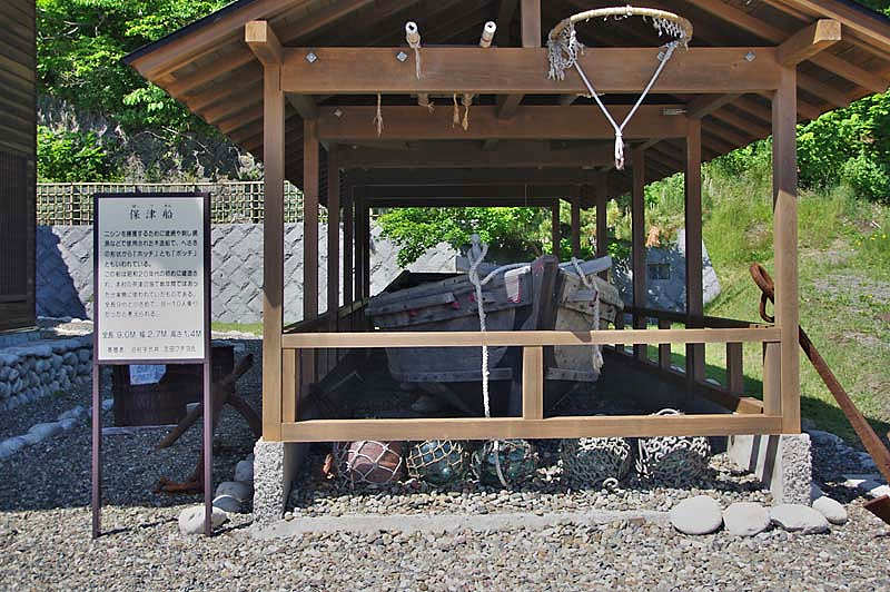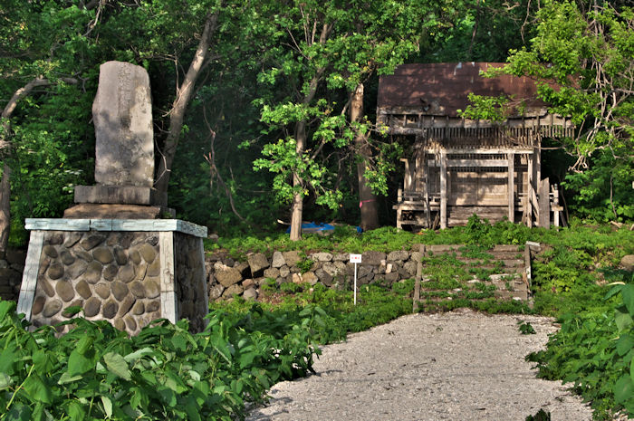 カクジュウ佐藤家の漁場建築は北海道有形文化財となっているが、新たに前浜に築造された袋澗、居宅と邸内社、背後の干場と、海から陸地へと連続して展開する北海道西海岸の漁場の佇まいを今日に伝える貴重な遺跡であるとのことで平成28(2016)年に国指定史跡となっている。カクジュウ佐藤家から40m程厳島神社よりの所に、佐藤伊三右衛門が発明した定置網の元祖といえる行成網記念碑があり、その背後に崩壊寸前という趣の邸内社がある。ニシン干し場は不明瞭だが、前浜の袋澗跡は崩壊して痕跡程度、説明されないと気づかないかも。◇所在地:寿都町字歌棄町有戸163番地 ◇G.Map:42.789567, 140.308685